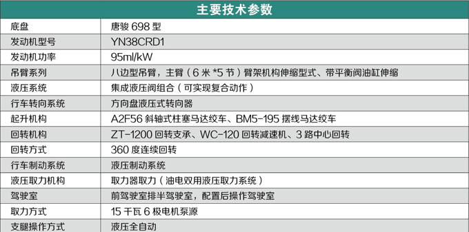 該產品是經國家檢驗機構認可的小型汽車起重機,以唐駿歐鈴專用汽車吊裝底盤做行走,駕駛更舒適、安全??砂惭b電機泵站,直接以380V電源作動力,節約環保。該產品通過全國機動車公告公示,在全國各地均可上牌照,并且購置費及其他營運費用全免,產品輕便靈活,價位低廉,適用于農村及城鄉結合部工作。低價位投資,高檔產品回報。