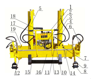 1、多路閥操縱手柄 2、齒輪泵 3、手動泵 4、升降缸 5、升降缸6、鉤行缸 7、限位銷孔 8、行走輪 9、行走臂 10、下道輪 11、撥缸 12、限位檔 13、支腳 14、限位銷 15、提軌鉤 16、機架 17、油箱 18、汽油機 19、從動限位塊