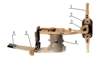 基本結構:1手把、2彈性把座、3調整板、4電機殼、5鎬板、6搗固爪